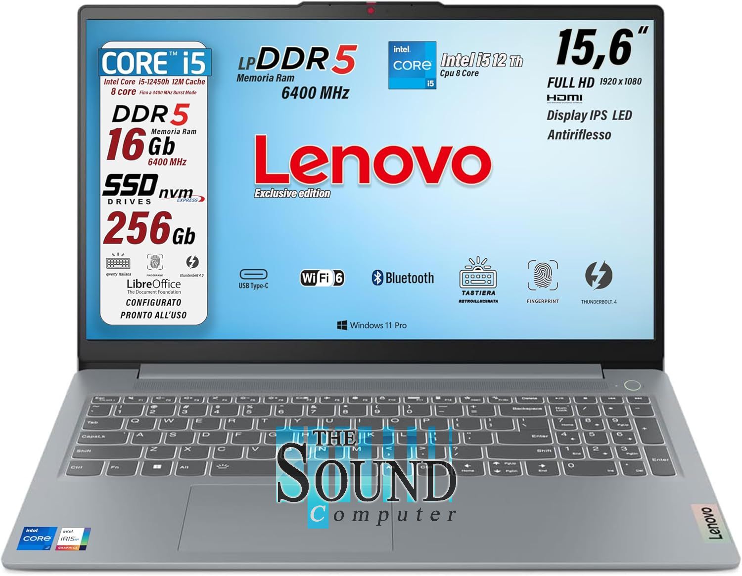 LENOVO, PC PORTATILE NOTEBOOK, I5 12450H 12TH, DDR5 16GB, DISPLAY IPS FHD 15,6", SSD 256 GB, WI-FI, BT, USB THUNDERBOLT, TASTIERA RETROILLUMINATA, FINGEPRINT INTEGRATO, WIN11 PRO, PRONTO ALL'USO |